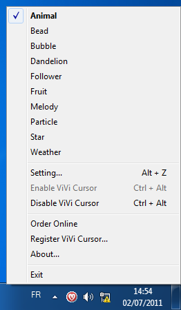 Votre environnement de bureau vous parait bien morne ? Dans ce cas, le logiciel ViVi Cursor de Vivisoftware pourrait vous intéresser. Il s'agit d'un petit logiciel qui ajoute des effets visuels à votre curseur sous Windows XP, Vista et Seven. Un grand nombre d’effets personnalisables sont disponibles tels que des petites étoiles, bulles, formes géométriques :